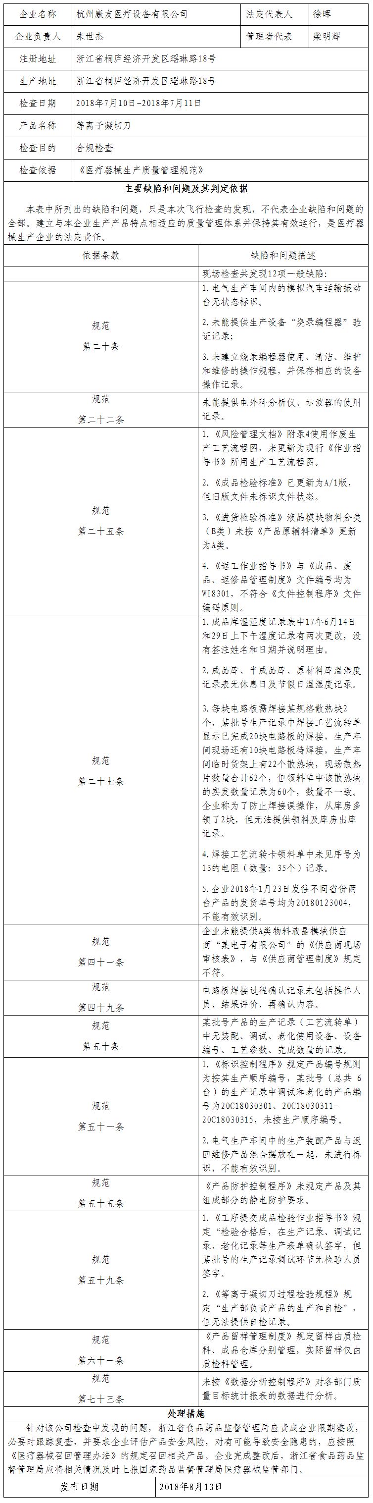 对杭州康友医疗设备有限公司飞行检查通报