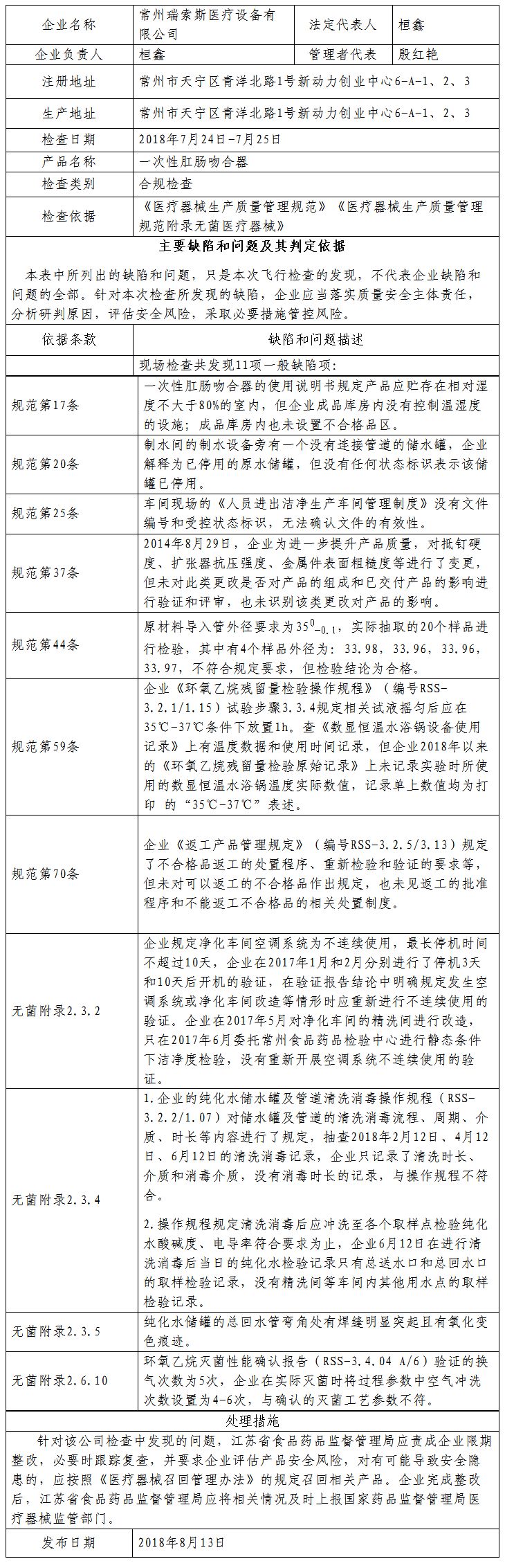 对常州瑞索斯医疗设备有限公司飞行检查通报