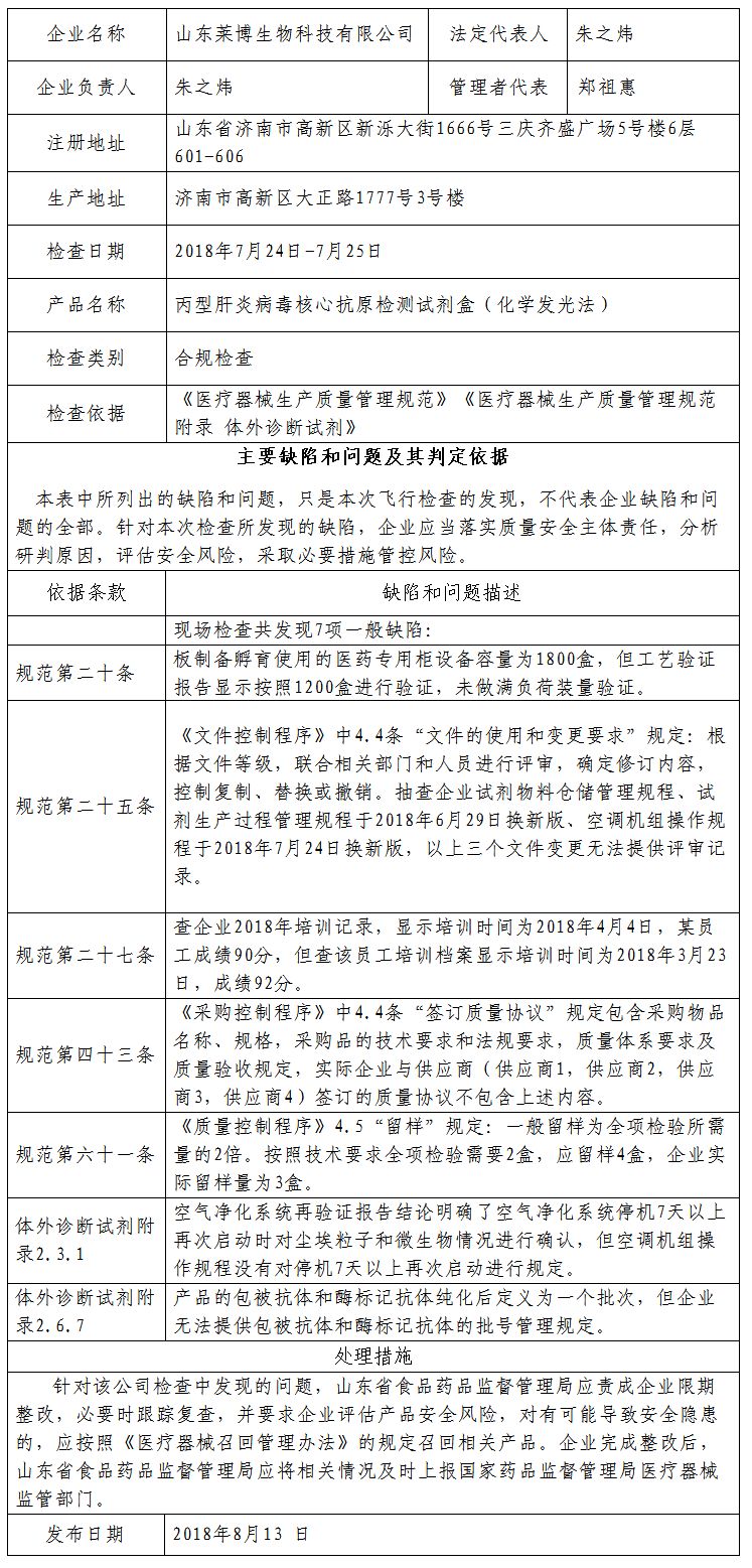 对山东莱博生物科技有限公司飞行检查通报