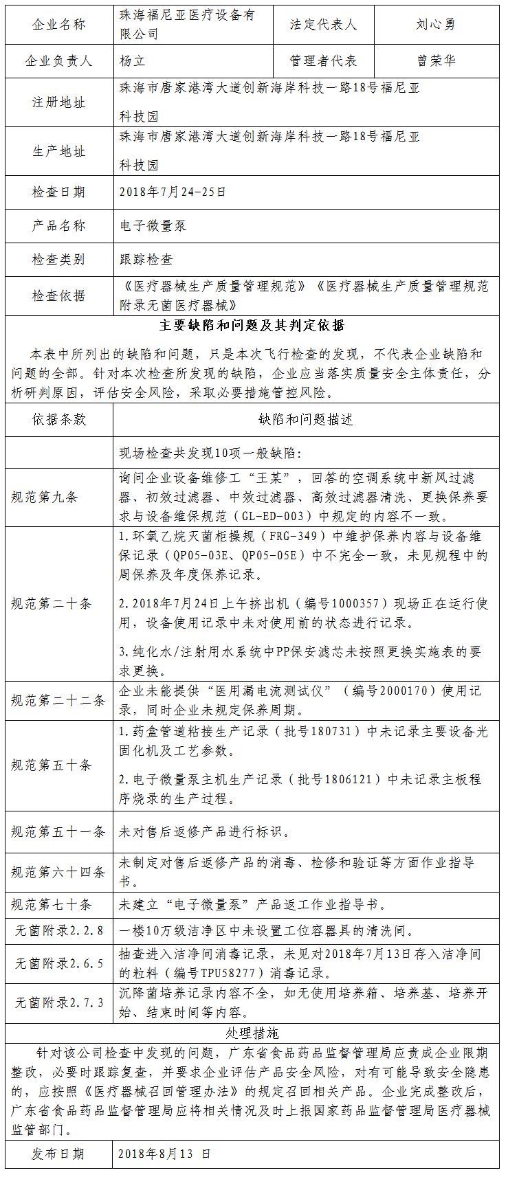 对珠海福尼亚医疗设备有限公司飞行检查通报