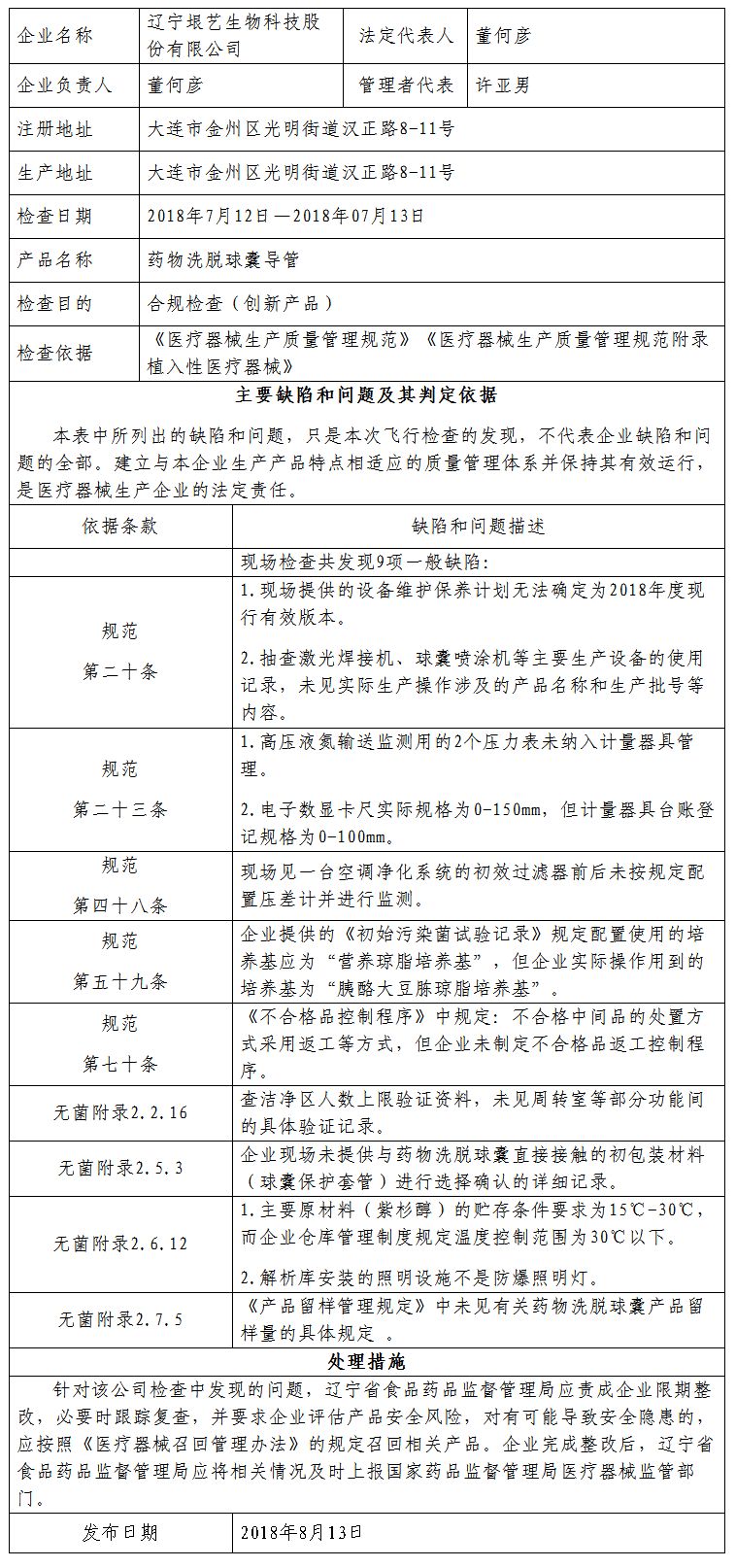 对辽宁垠艺生物科技股份有限公司飞行检查通报