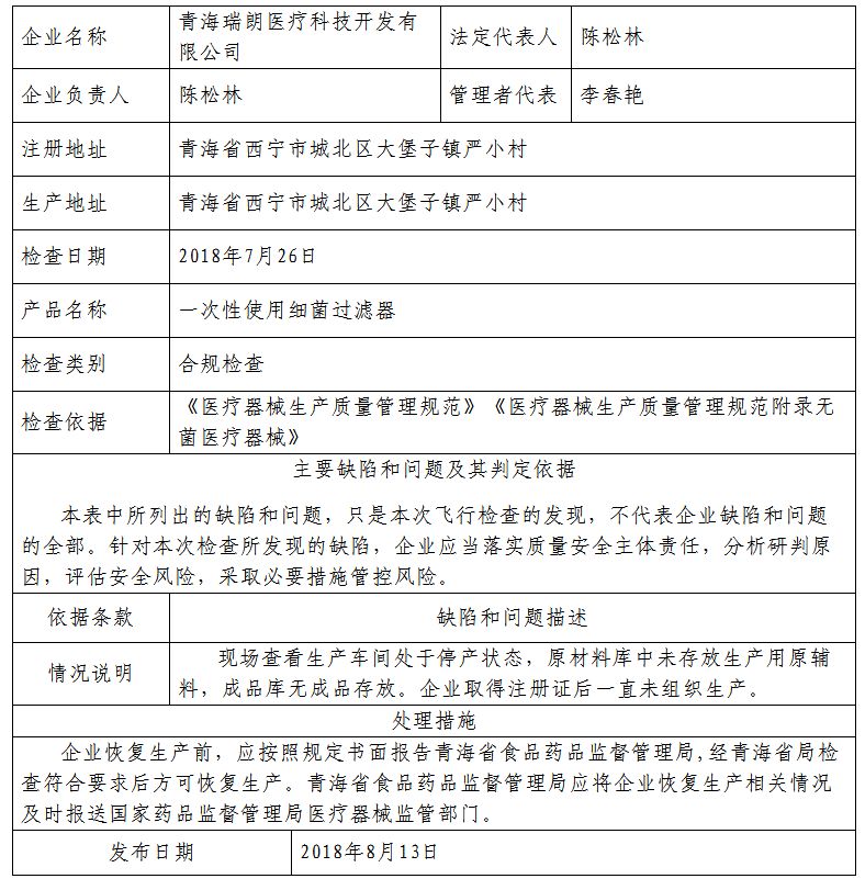 对青海瑞朗医疗科技开发有限公司飞行检查通报